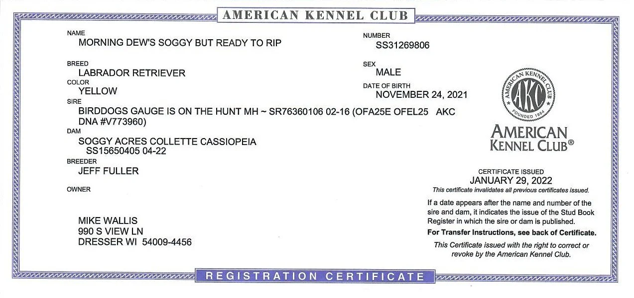 Rip’s pedigree is very solid. Rip achieved his Senior Hunter title and is working toward his Master Hunter title.